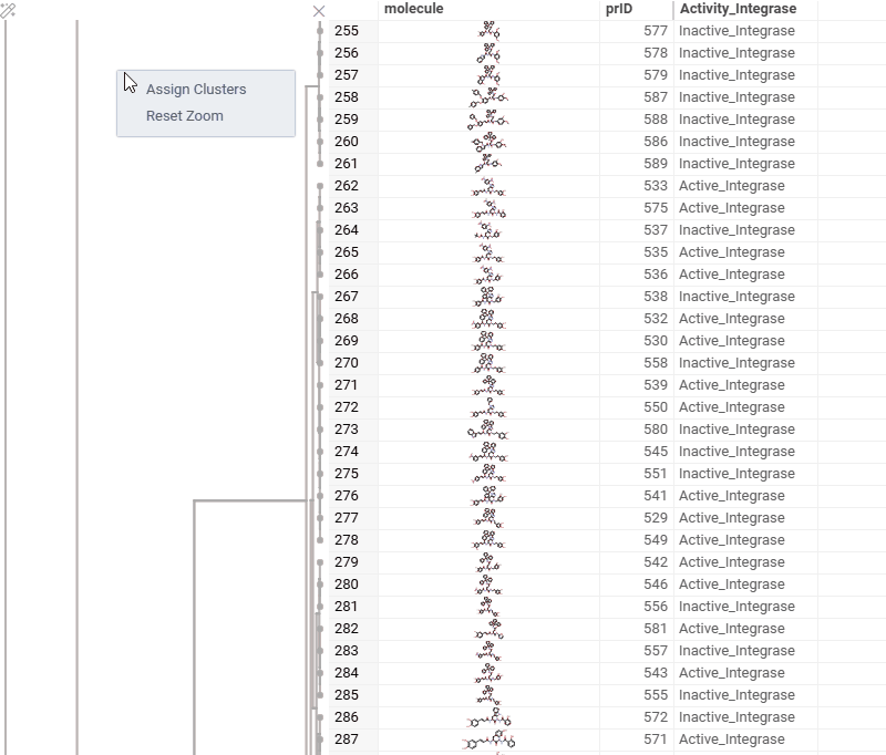 Users can also cluster Molecule columns alongside with numeric or Macromolecule(sequence) columns. In such cases, Distance matrices will be calculated for both, normalized and added together.