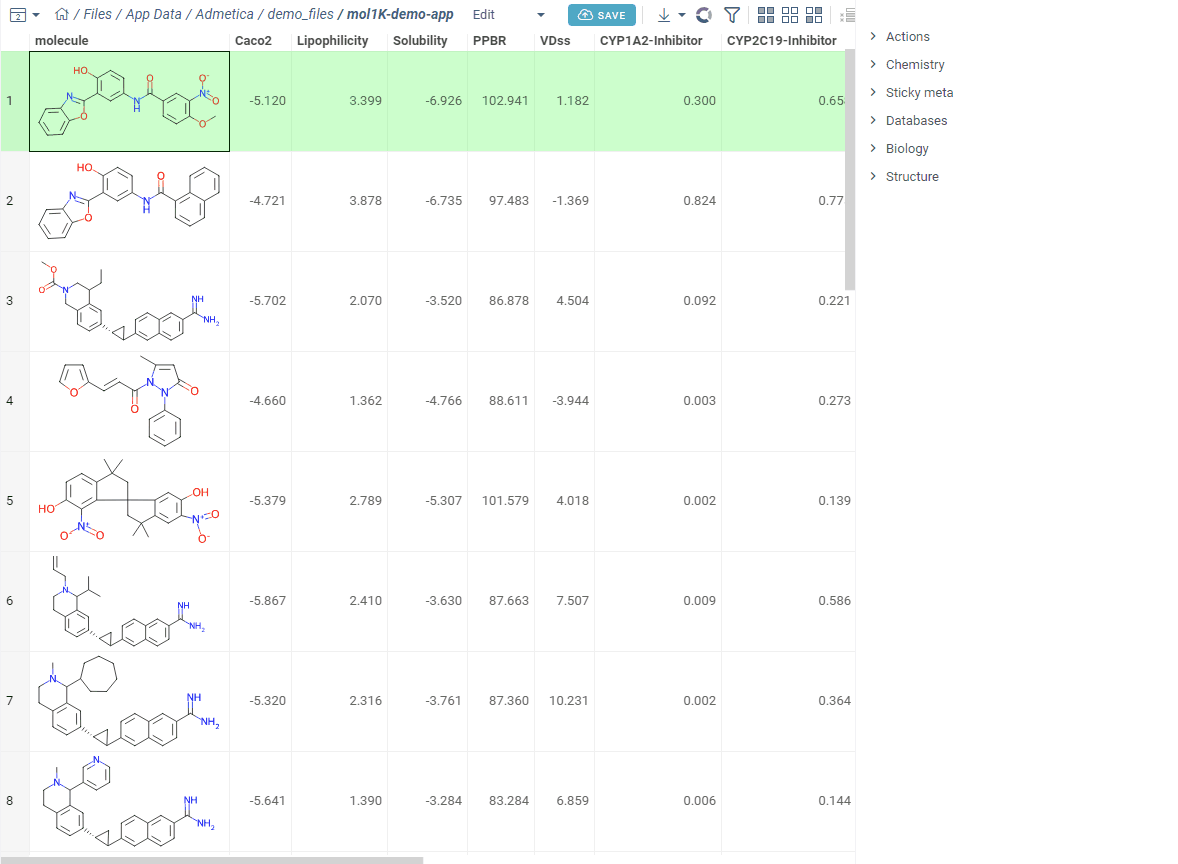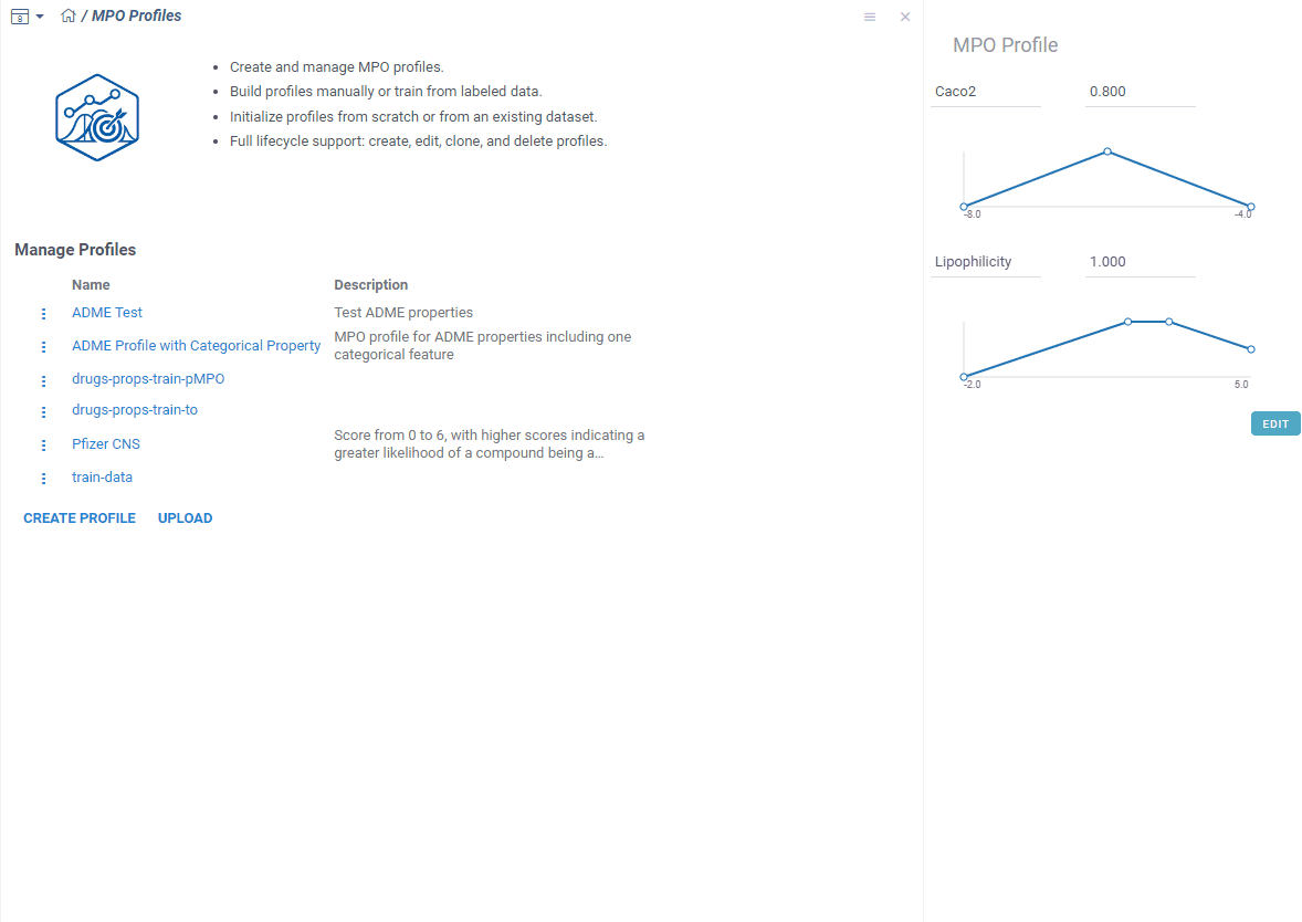 Your starting point is Apps→ Chem → MPO Profiles. Here you see all your saved profiles. You can edit, clone, delete, or download any of them as a JSON file. Someone sent you theirs? Just upload it.