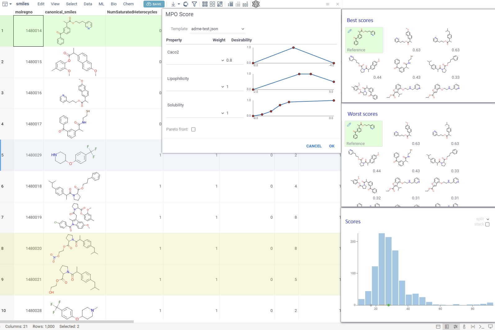 We are interested to hear your ideas on how can Datagrok best support the process of creating the MPO profile. One idea is to provide an interactive feedback on each change. Scores would be recalculated whenever any change is made to the profile (added or removed properties or changed the desirability function), but in addition to that we are thinking of providing this information in the context panel: