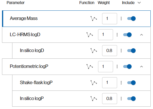 @ejaeger1 Better said “fallback desirability function” - each property has its own desirability function, but some property get considered only if a “parent property” is missing. For instance in this screenshot, if there is no experimental value for Potentiometric logP, the value from the shake-flask experiment will be used. If this one is not available it will use the desirability function of the in silico logP with a lower weight.