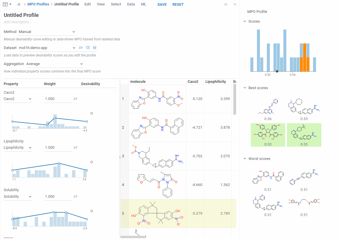 As you edit, the right side updates right away: you see a score histogram and the best and worst scoring molecules. Click any molecule to find it in the grid. This makes it easy to experiment — change a desirability curve, see the effect instantly.